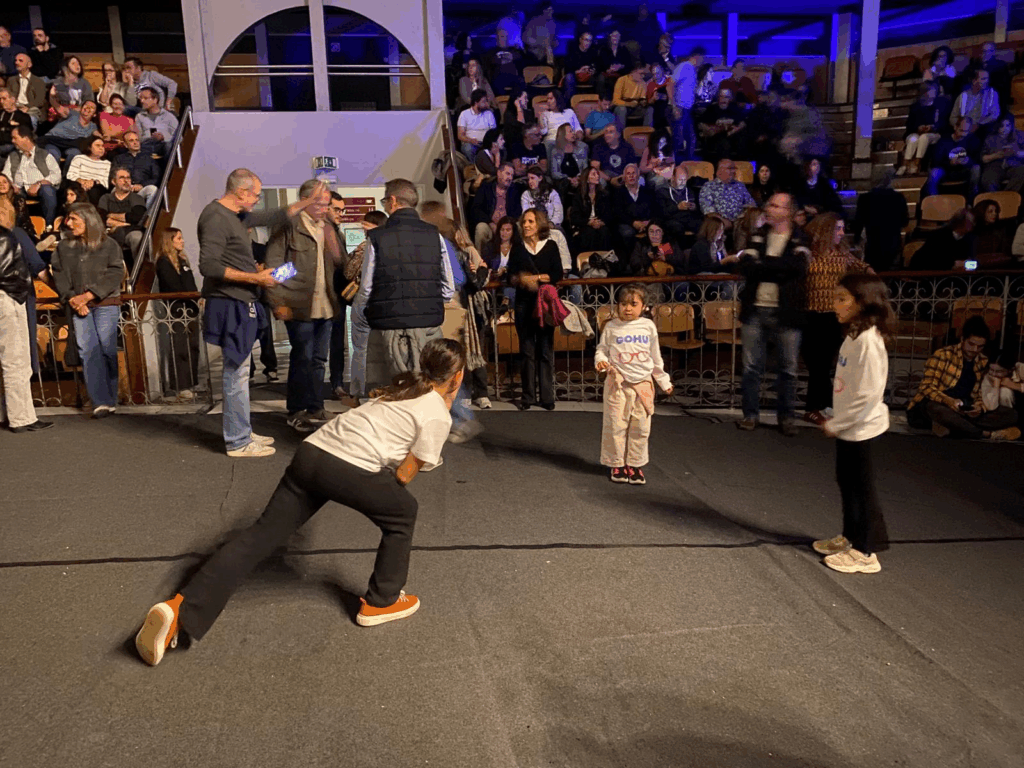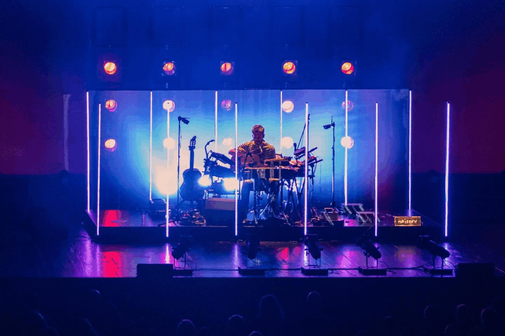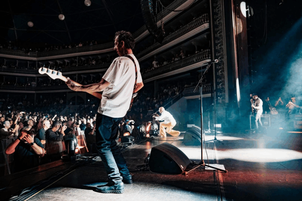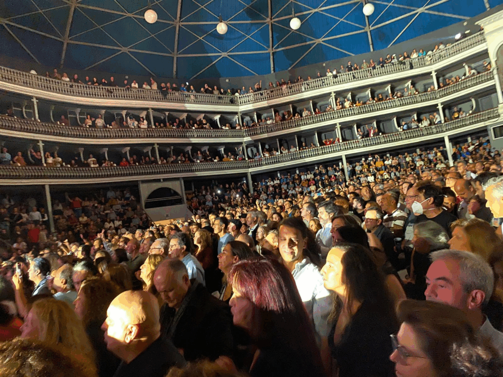 O palco central circular, colocado abaixo da linha do público e rodeado a 360 graus por espectadores, configurou um verdadeiro anfiteatro reverso, invertendo a hierarquia tradicional entre intérprete e plateia. Os músicos surgiam submersos no público, não como ídolos elevados, mas como centro visível de uma comunidade provisória reunida em torno da escuta.