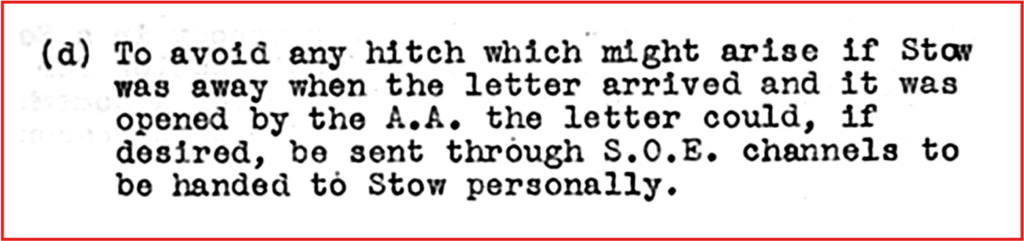 O SOE chega a propor, por exemplo, ao Ministério do Ar um contacto com Stow através do canal reservado das Operações Especiais de forma a impedir que o Adido da Força Aérea, seu responsável hierárquico directo, tenha conhecimento da sua colaboração.