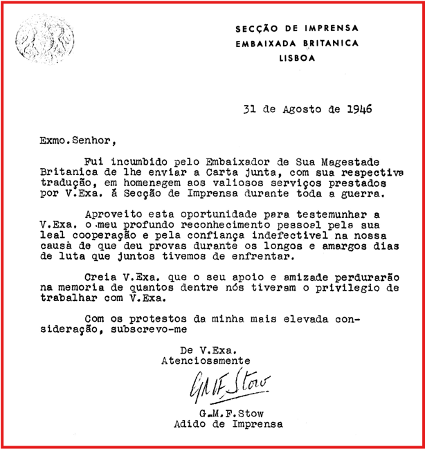 A primeira missiva era do adido de Imprensa. G.M.F. Stow homenageia, a pedido do embaixador, o meu avô pelos “valiosos serviços prestados” à Secção de Imprensa “durante toda a guerra” e aproveita a oportunidade para lhe testemunhar o seu “profundo reconhecimento pessoal pela sua leal cooperação e pela confiança indefectível na nossa causa [sic] de que deu provas durante os longos e amargos dias de luta” que juntos tiveram de enfrentar.