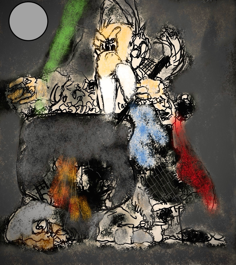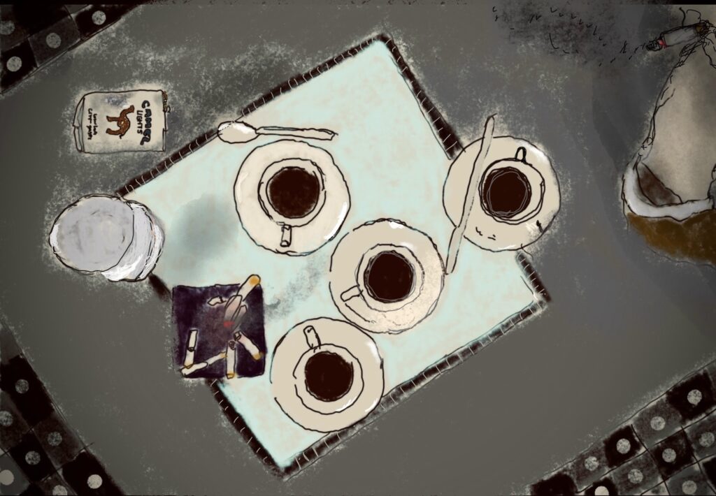 – Não. Claro que não. Assim, assim não. Ninguém fala assim. Ele dizia coisas e depois eu ía anotando, depois compus mais ou menos nas notas. Mas ouve o resto. Não interrompas. “… Por entre a deriva em explicar a Arte, na sua quietude e finitude, alcançamos, como pressuposto, uma ideia, por vezes, muito simples – ou seja, na tentativa de a compreendermos melhor, tentamos avaliá-la, ainda, em torno da sua antiga e discutível dicotomia – figurativo/abstracto, do maior ou menor emprego de valores tidos como simbólicos ou do modo como determinados procedimentos são empregues, entre outros”.