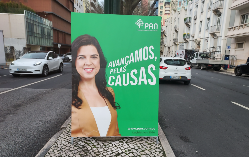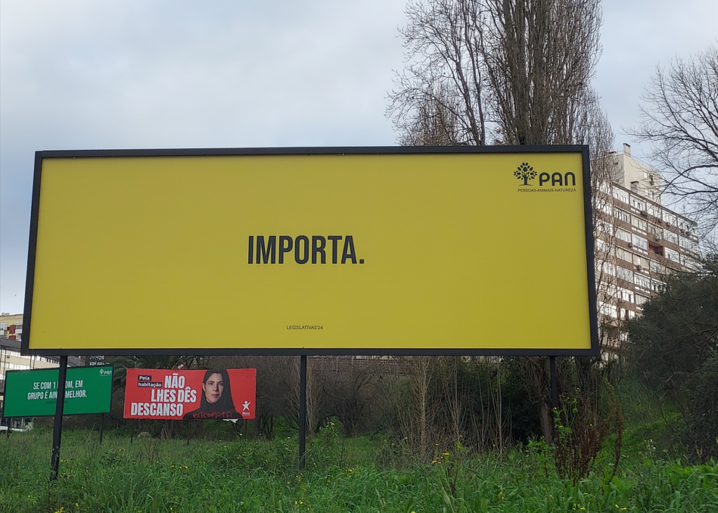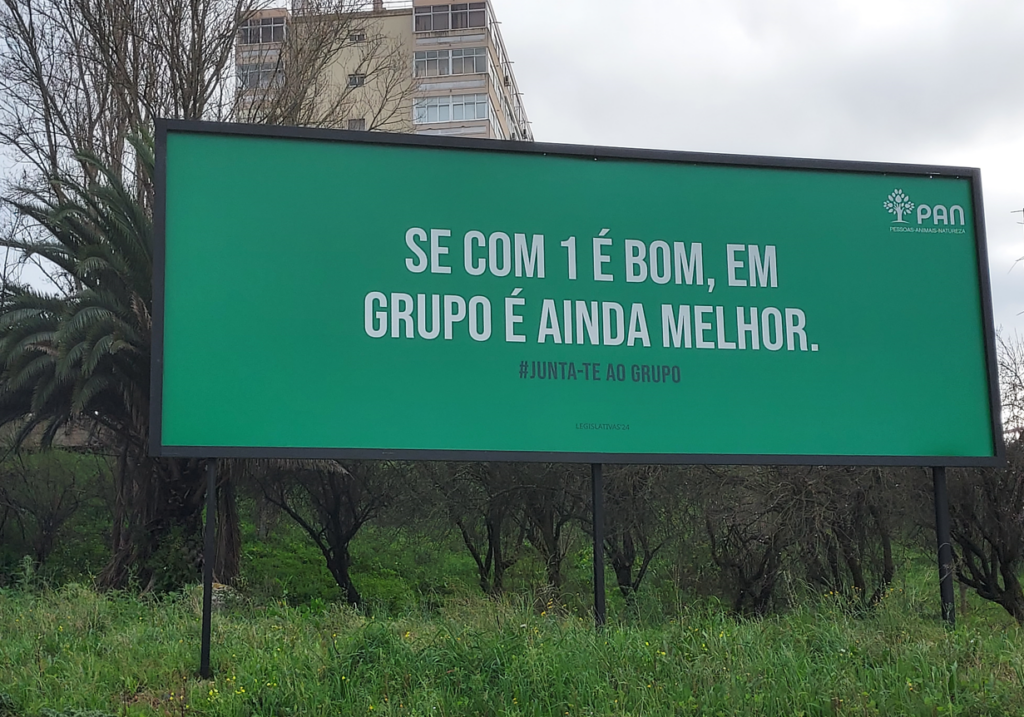 Com o objectivo de recuperar um grupo parlamentar nestas eleições, o PAN lançou uma campanha de outdoors concebida internamente aliando um mupi genérico com o retrato da sua líder Inês Sousa Real e estruturas de grande formato com mensagens provocatórias para ganhar maior visibilidade e quiçá despertar a polémica.