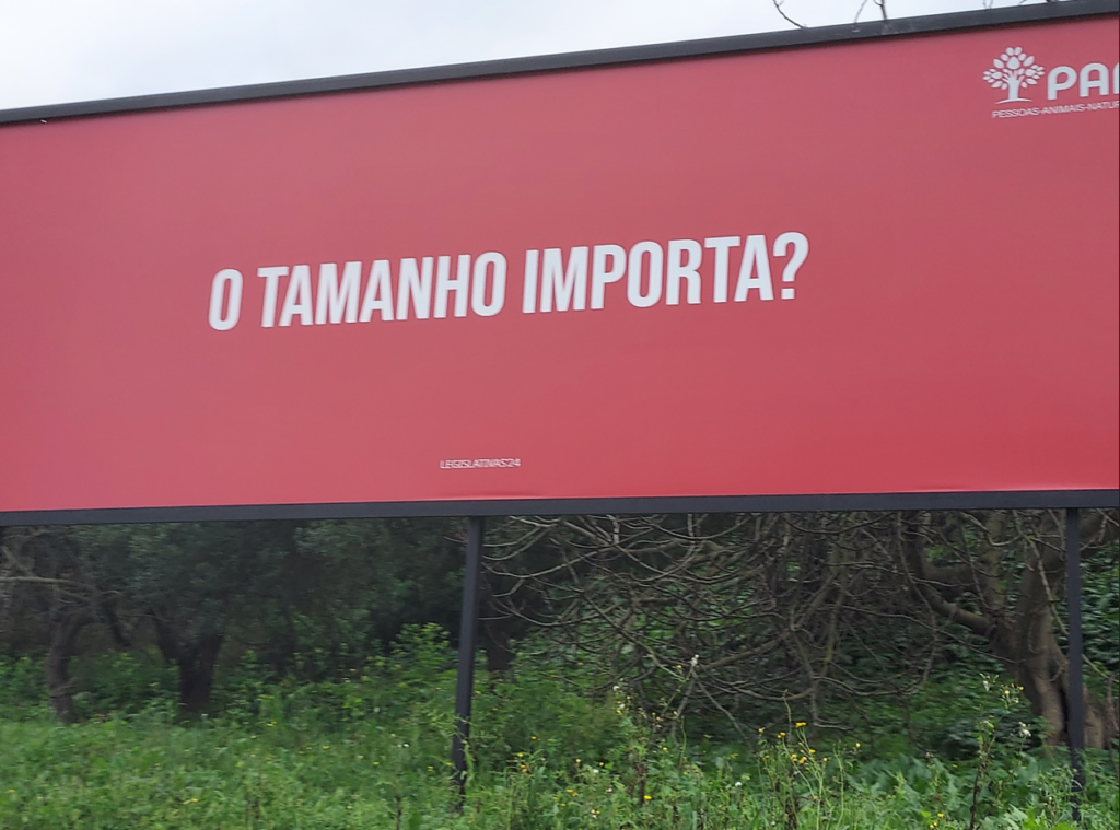 Em Lisboa, numa das principais entradas da cidade a propaganda PAN é composta por três outdoors usando uma composição exclusivamente tipográfica, que varia nas cores de fundo. O primeiro outdoor pergunta: “O tamanho importa?” O segundo responde: “Importa.” E o terceiro completa: “Se com 1 é bom, em grupo é ainda melhor.”