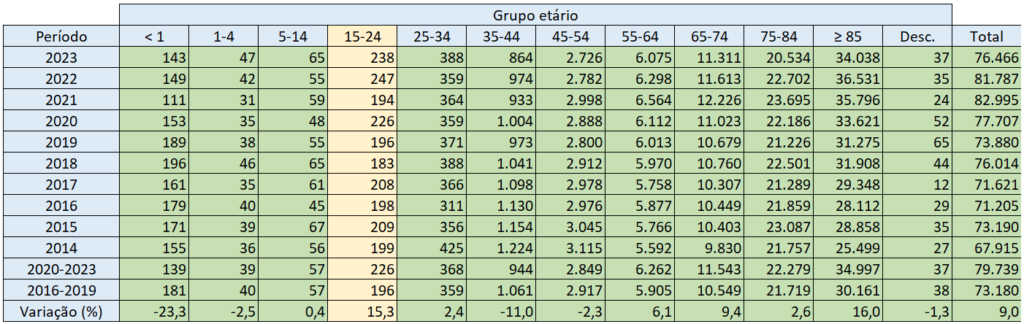 Como a variação entre quadriénios no grupo etário dos 25 aos 34 anos também se mostra baixa (apenas 2,4%), sendo que os números de óbitos em 2022 e até de 2023 são superados por outros anos do período 2014-2019, mais se destaca assim, pela negativa, a situação da mortalidade dos adolescentes e jovens adultos dos 15 aos 24 anos.