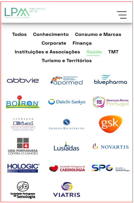 De acordo com o levantamento do PÁGINA UM, a LPM identifica como seus clientes, apenas no sector da Saúde, sete farmacêuticas – AbbVie, Bluepharma, Daiichi-Sankyo, Gedeon Richter, GlaxoSmithKline, Novartis e Viatris –, uma empresa de homeopatia (Boiron), duas entidades na área do diagnóstico – a empresa Hologic e a Associação Portuguesa das Empresas de Diagnósticos Médicos (Apormed) –, uma empresa hospitalar privada (Lusíadas), uma fundação associada a uma farmacêutica (Fundação Bial), duas organizações não-governamentais sem fins lucrativos (Liga Portuguesa contra o Cancro e a União das Associações das Doenças Raras de Portugal) e ainda três sociedades médicas (Sociedade Portuguesa de Senologia, Sociedade Portuguesa de Gastrenterologia e Sociedade Portuguesa de Cardiologia). Esta última sociedade médica é aquela que mais financiamento obtém do sector farmacêutico desde 2017, enquanto a penúltima se encontra no top 10.
