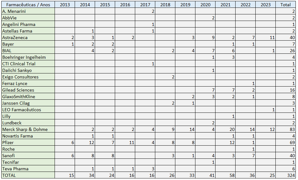 N.D. A descrição, entre aspas, é aquela que consta no Portal da Transparência e Publicidade. No caso de empresas subsidiárias de farmacêuticas, optou-se por as agregar e atribuir o apoio (e relação comercial) à empresa-mãe.