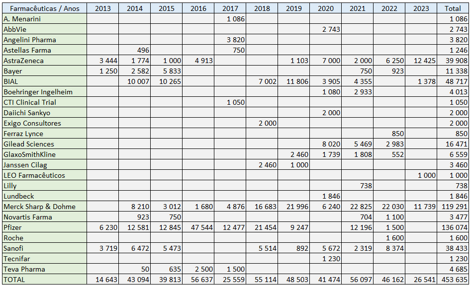 Montantes recebidos por Flipe Froes pela participação em eventos e prestação de serviços (contratos), por farmacêutica, desde 2013 até 18 de Agosto de 2023. Fonte: Portal da Transparência e Publicidade do Infarmed.