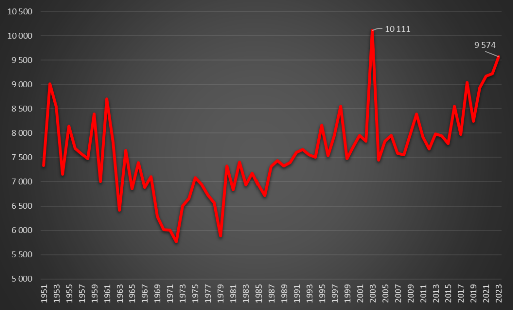 Consultando os dados do INE desde 1951, e compilando os últimos registos diários do Sistema de Informação dos Certificados de Óbito (SICO), o Agosto de 2023 é o segundo pior, embora o terceiro consecutivo acima dos 9.000 óbitos: em 2021 contabilizaram-se 9.227 mortes e no ano passado 9.309 mortes. Saliente-se que antes de 1951 registaram-se alguns meses de Agosto mais mortíferos, mas nessa época a mortalidade no Verão estava sobretudo associado a doenças associadas à falta de higiene e problemas de saneamento que proliferavam com o aumento da temperatura na época de estio.