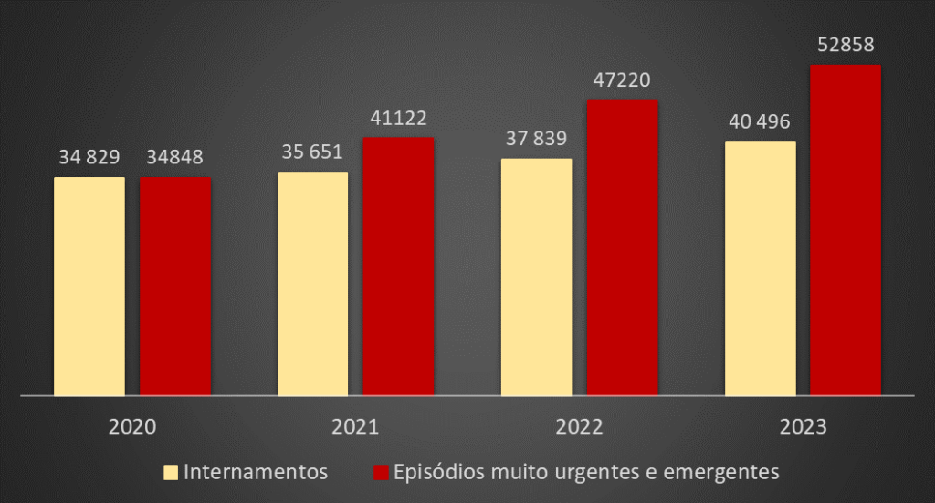 Se se comparar com o triénio 2020-2022, o crescimento de casos de emergência cresceu 27% e os de muita urgência quase 29%.