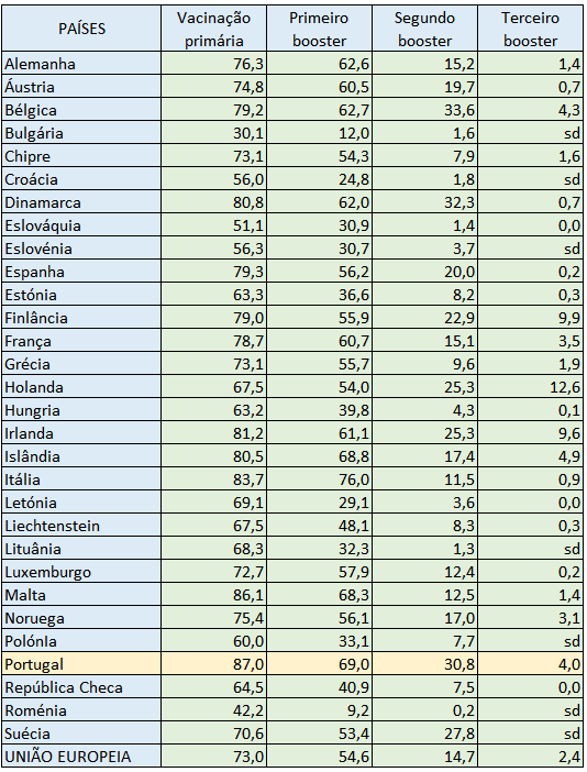 Evolução da adesão (% da população total) ao programa vacinal na Europa nas diversas fases. Nota: sd (sem dados). Fonte: ECDC.