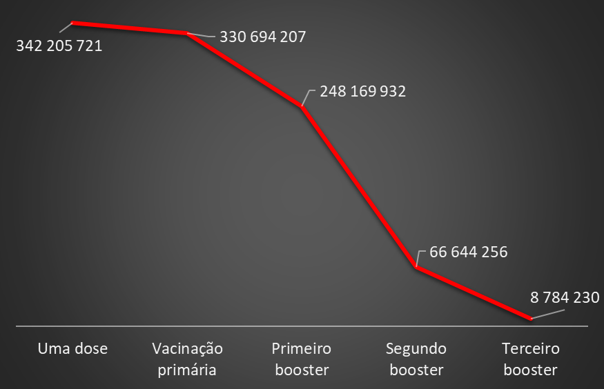 Em termos globais, a ECDC aponta assim para uma adesão de apenas 2,4% dos europeus aos terceiro booster, quando atingira 14,7% no segundo booster, os 54,6% no primeiro booster e os 73% na vacinação primária. Em termos absolutos, nos países europeus abrangidos pelo ECDC (União Europeia e ainda Islândia, Liechtenstein e Noruega), foram administradas mais de 330 milhões de doses em vacinação primária (houve cerca de 342 milhões de pessoas que optaram apenas por uma dose), baixando para 248 milhões quando as autoridades consideraram a necessidade de um reforço. Ao segundo reforço só responderam já um pouco menos de 67 milhões de pessoas. E para o terceiro booster já só mostraram interesse menos de 9 milhões de europeus. Assim, entre a vacinação primária e o terceiro reforço, contabiliza-se uma redução de 97,3%.