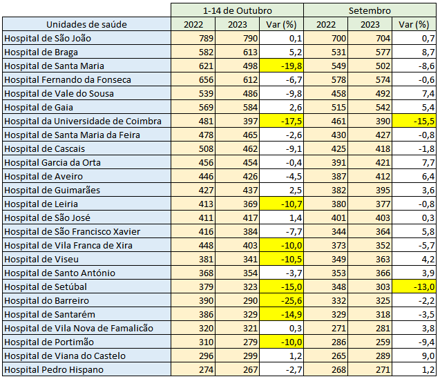 Estes números de Outubro – que serão induzidos pela instabilidade do SNS e pela percepção dos pacientes de que haverá falhas no serviço em caso de se deslocarem a hospitais públicos – acabam por atenuar uma previsível nova sobrecarga nos serviços hospitalares após os dois primeiros anos de pandemia (2020 e 2021).
