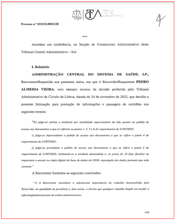A “luta” vai, neste momento, já no Supremo Tribunal Administrativo. Esta semana, o PÁGINA UM teve de contra-alegar no recurso apresentado pela Administração Central do Sistema de Saúde, depois desta entidade tutelada pelo ministro Manuel Pizarro ter tido já duas decisões desfavoráveis. A primeira, em 24 de Novembro do ano passado, através da sentença do Tribunal Administrativo de Lisboa. A segunda, mais recente, em 23 de Março deste ano, através do acórdão de três desembargadores do Tribunal Central Administrativo Sul.