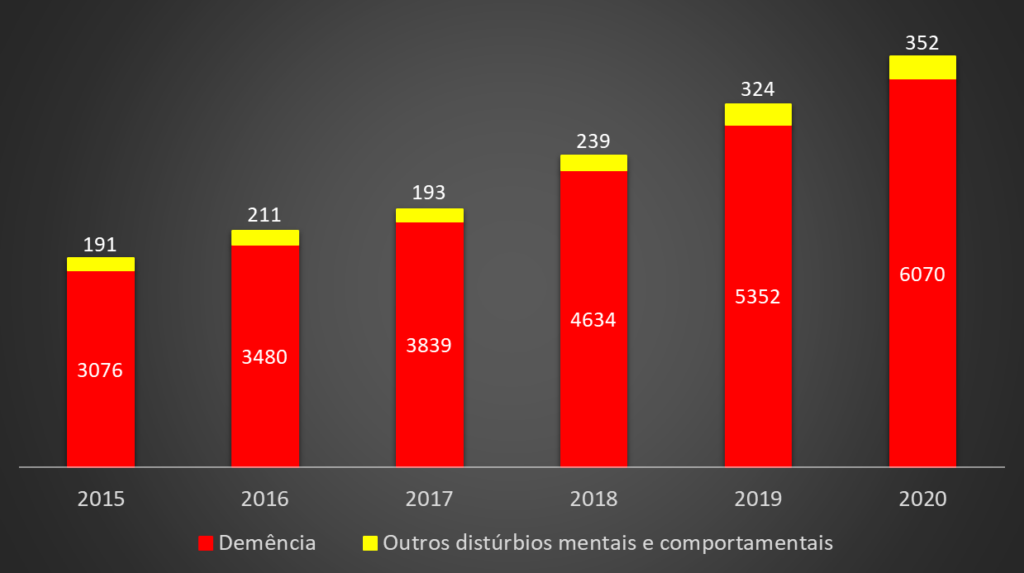 Neste grupo, a demência – onde se insere a demência vascular por destruição de tecido cerebral – constitui o grosso das mortes e do incremento neste período, tendo passado de 3.076 óbitos em 2015 para 6.070 em 2020. Cerca de dois terços das pessoas falecidas tinham mais de 85 anos, e 99,4% mais de 65 anos.