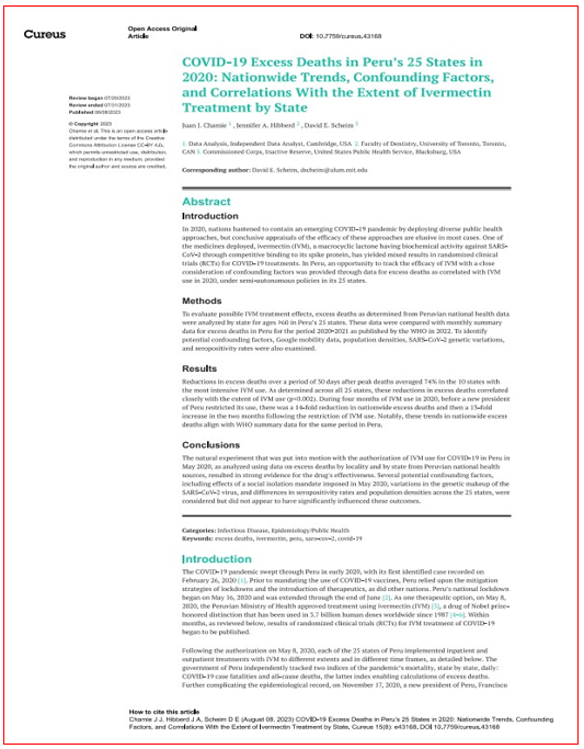 Os autores do estudo – os norte-americanos Juan J. Chamie e David E. Scheim e a canadiana Jennifer A. Hibberd – concluem que, no Peru, “o uso profilático de ivermectina pode ter contribuído para a redução média de 74% no excesso de mortes 30 dias após o pico de mortes nos 10 estados abrangidos pelo programa MOT”, enquanto a redução média terá sido de 53% no excesso de mortes naquele período nos estados.