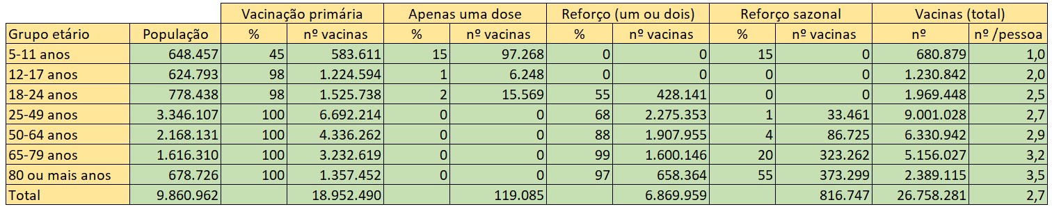 Em Portugal, a campanha de reforço em curso – denominada de “sazonal”, embora seja a quarta ou quinta dose para a maioria dos casos – foi iniciada na primeira quinzena de Setembro, foram “alcançadas”, por agora, pouco mais de um milhão de pessoas.