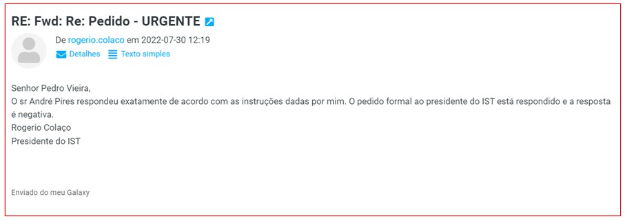 Mas o presidente do IST sempre recusou disponibilizar essa informação. Aliás, a única vez que Rogério Colaço se dirigiu ao PÁGINA UM foi numa lacónica mensagem enviada através do seu Galaxy: “O pedido formal ao presidente do IST está respondido e a resposta é negativa.”