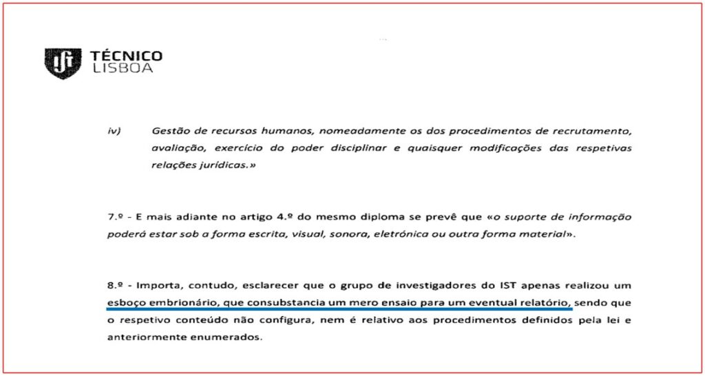Ou seja, o IST pretende ver reconhecido pelo Tribunal Administrativo de Lisboa que o relatório que a Lusa garante existir, afinal não existe porque não passa afinal de um esboço – ou menos do que isso: “um esboço embrionário, que consubstancia um mero ensaio para um eventual relatório”.