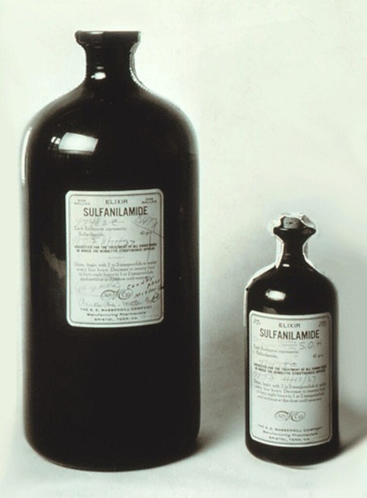 Elixir Sulfanilamide Criado sob a forma de comprimido em 1937, pela farmacêutica americana Massengil, sulfamilamida era um antibiótico revolucionário. Porém, para aumentar as vendas, decidiu transformar o medicamento em elixir, para lhe introduzir um sabor agradável a framboesa.