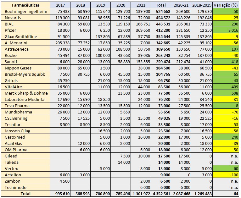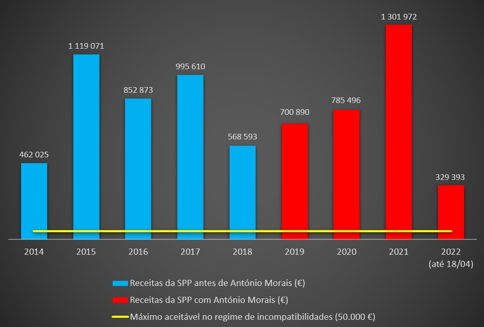 No quinquénio 2017-2021, que engloba já os três anos de presidência de António Morais, os montantes arrecadados pela SPP ainda aumentaram mais: situam-se nos 870.512 euros por ano. Para este aumento muito contribuiu o ano passado em que a SPP recebeu um financiamento recorde vindo do sector farmacêutico de 1.301.972 euros.