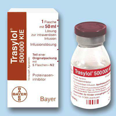 Desenvolvido pela farmacêutica alemã Bayer, a aprotinina, comercializada sob o nome Trasylol, foi aprovada pela FDA em 1993 para ser usada em blocos operatórios para reduzir no sangramento em cirurgias cardíacas e hepáticas.