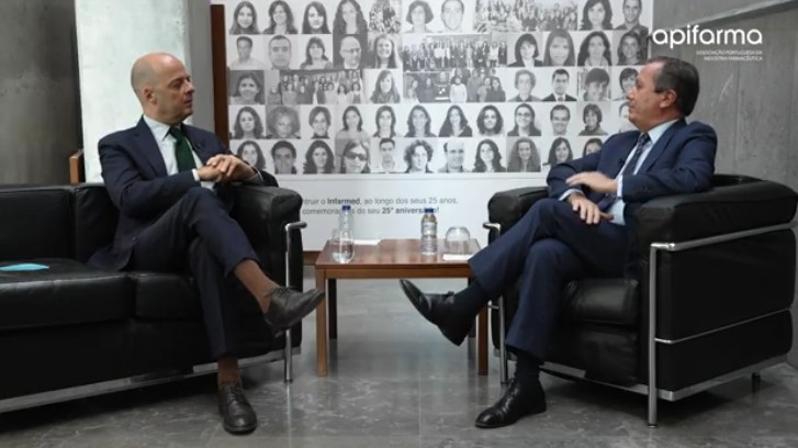 À direita, Rui dos Santos Ivo, presidente do Infarmed, em descontraída entrevista em Setembro do ano passado, para o portal da Associação Portuguesa da Indústria Farmacêutica (APIFARMA), na qual já foi director executivo (2008-2011). À esquerda André Macedo, antigo jornalista e ex-director-adjunto da RTP e que agora trabalha numa agência de comunicação.