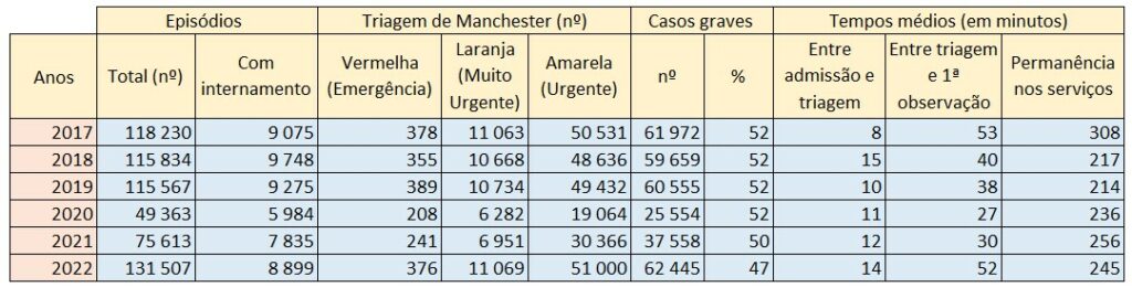 De facto, considerando a Triagem de Manchester, no período em análise deste ano contabilizaram-se 62.445 doentes triados nas urgências, dos quais 376 com pulseira vermelha (emergência), 11.069 com pulseira laranja (muito urgente) e 51.000 com pulseira amarela (urgente). Em termos absolutos, estes valores são os mais elevados face ao período homólogo entre 2017 e 2021.