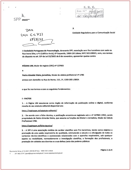 Primeira página da queixa da Sociedade Portuguesa de Pneumologia à Entidade Reguladora para a Comunicação Social.