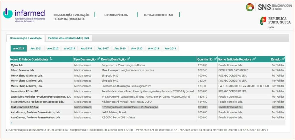 Também desvendou os meandros do último congresso de pneumologia, em Novembro passado, salientando que a SPP recebeu patrocínios de farmacêuticas no valor de 562.381,60 euros. Além disso, revelou que 14 empresas deste sector pagaram as inscrições ou as participações em eventos de quase quatro centenas de pneumologistas, tendo sido divulgados os nomes que constam na Plataforma da Transparência e Publicidade do Infarmed.