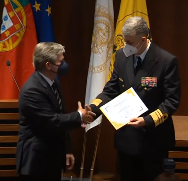 Rui Nunes, presidente “perpétuo” da Associação Portuguesa de Bioética, cumprimenta Gouveia e Melo no acto de entrega do Prémio Nacional de Bioética em Novembro do ano passado.