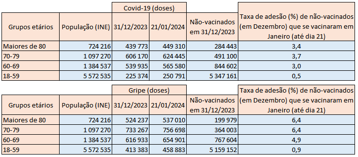 No caso dos menores de 60 anos, e incluindo somente os maiores de idade), a adesão foi paupérrima: somente um em cada 200 pessoas (0,5%) que não se tinham vacinado contra a covid-19 em Dezembro quiserem receber uma dose de vacina ao longo de Janeiro (até dia 21), aumentando esse valor para menos de um em cada 100 (0,9%) para a vacina contra a gripe.