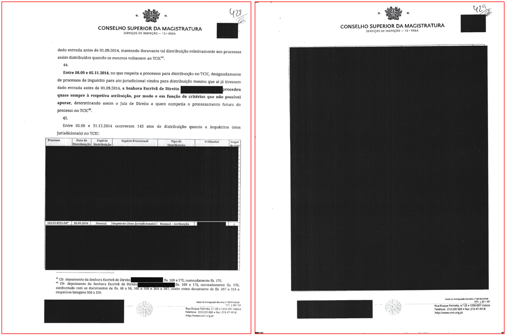 Saliente-se que, em Agosto de 2023, o CSM chegou a disponibilizar ao PÁGINA UM diversas fotocópias completamente mutiladas, apagando assim os nomes dos intervenientes no processo disciplinar, a descrição dos eventos, o número do processo, a data da distribuição e o nome do escrivão que interveio.