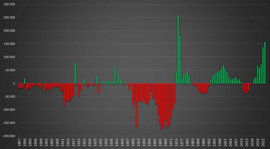 E, de facto, se é certo que, desde 2018, foram os municípios urbanos que contabilizaram números mais elevados de dinâmica migratória (favorável às entradas), mostra-se surpreendente que haja municípios rurais onde os fluxos relativos são bastante superiores. Aliás, um aspecto ainda mais surpreendente se salienta na análise aos dados do INE: mesmo com o saldo natural bastante negativo em grande parte do país, o saldo migratório é positivo na generalidade do território nacional, com poucas excepções. Com efeito, no somatório dos fluxos migratórios entre 2018 e 2023, apenas 11 concelhos, entre 308, apresentaram mais saída do que entradas, a saber: Castelo de Paiva (-2 pessoas), Vila Franca do Campo (-24), Arouca (-52), Barrancos (-53), Portalegre (-76), Cinfães (-91), Resende (-101), Peso da Régua (-118), Baião (-216) e Felgueiras (-770).