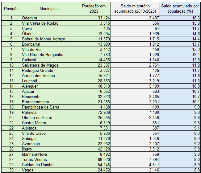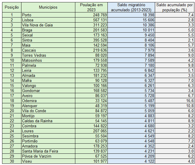 Estes casos isolados revelam, assim, uma nova faceta demográfica de Portugal, com um país a crescer em número de pessoas, mas com saldos naturais negativos. Exemplo disso sucede em Lisboa, que apesar de ter mais mortes do que nascimentos, registou um saldo migratório acumulado, entre 2018 e 2023, de 15.606 pessoas, sendo apenas ultrapassado pelo Porto, que teve um aumento de 18.398 indivíduos neste período. Os restantes oito concelhos do top 10 dos saldos migratórios acumulados são todos urbanos, do eixo Porto-Braga e da Área Metropolitana de Lisboa, a saber: Vila Nova de Gaia (+10.386 indivíduos), Braga (+10.011), Seixal (+9.450), Sintra (+8.404), Maia (+8.106), Cascais (+7.979), Torres Vedras (+7.894) e Matosinhos (+7.589). Esta dezena de municípios representa quase um quarto (23,3%) do total do fluxo migratório em todo o país entre 2018 e 2023, que totalizou pouco mais de 445 mil pessoas.