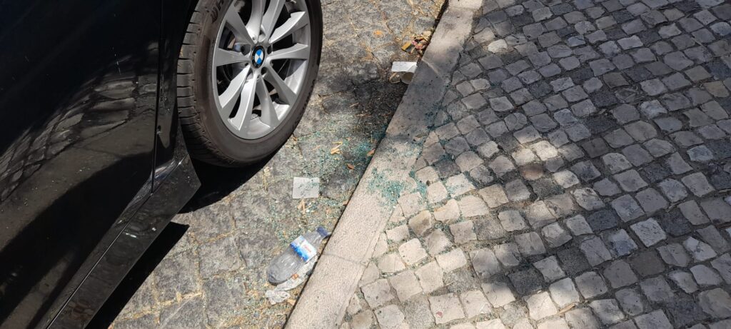 Ao descer a Calçada, continuam no mesmo sítio as garrafas e latas colocadas nos diversos orifícios que se encontram no muro que desce aquela via. E são visíveis, no chão, vidros de viaturas, que terão sido assaltadas recentemente.