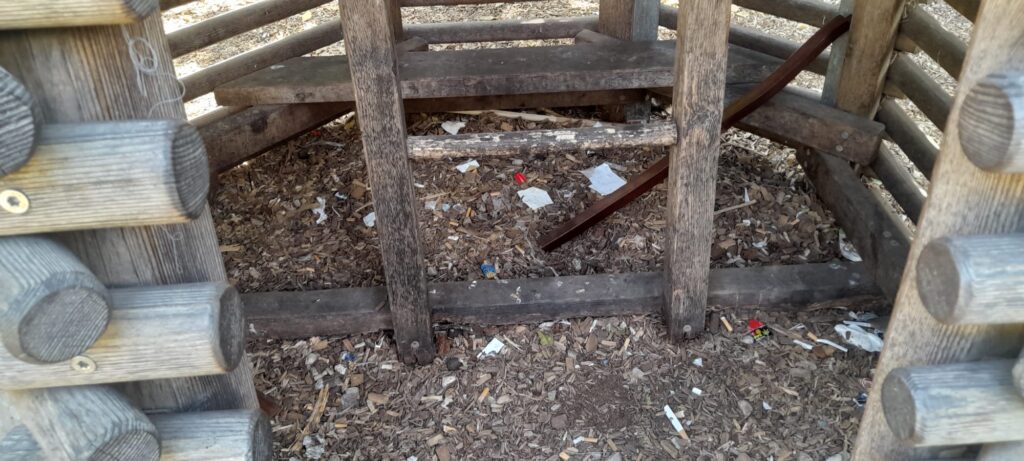 No escorrega das crianças mais crescidas, o “abrigo” de madeira com escadas que dão acesso ao escorrega já não tinha seringas nem cartões bancários ou carteiras roubadas. Mas encontrava-se com algum lixo, incluindo muitas beatas.