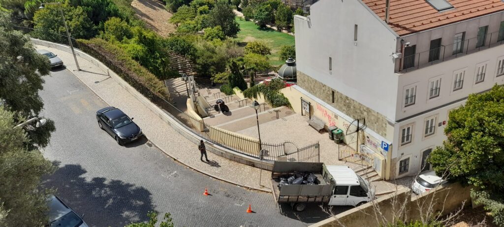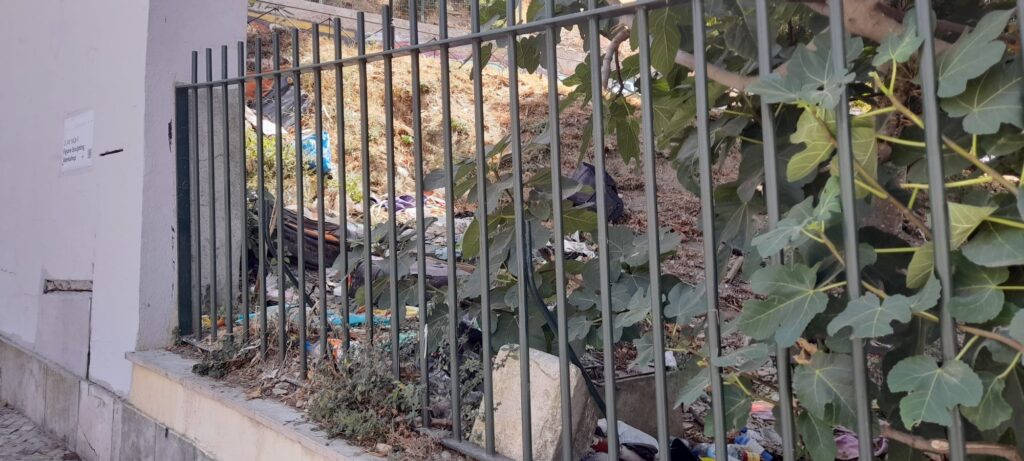 As escadas por onde as crianças sobrem para andar no escorrega maior ainda apresentam lixo variado. Mas já não havia lá seringas nem carteiras roubadas. Nesta nossa segunda visita ao Jardim, observámos que uma antiga porta de correr ocupava uma parte do chão do parque destinado a brincadeiras com areia. Havia beatas espalhadas pelo recinto dedicado aos mais novos.A primeira imagem que os turistas encontram do Jardim da Cerca da Graça é esta: lixo diverso, incluindo malas de viagem sujas, “descem” colina abaixo e já fazem parte da paisagem, ao lado de figueiras e outras árvores e arbustos.