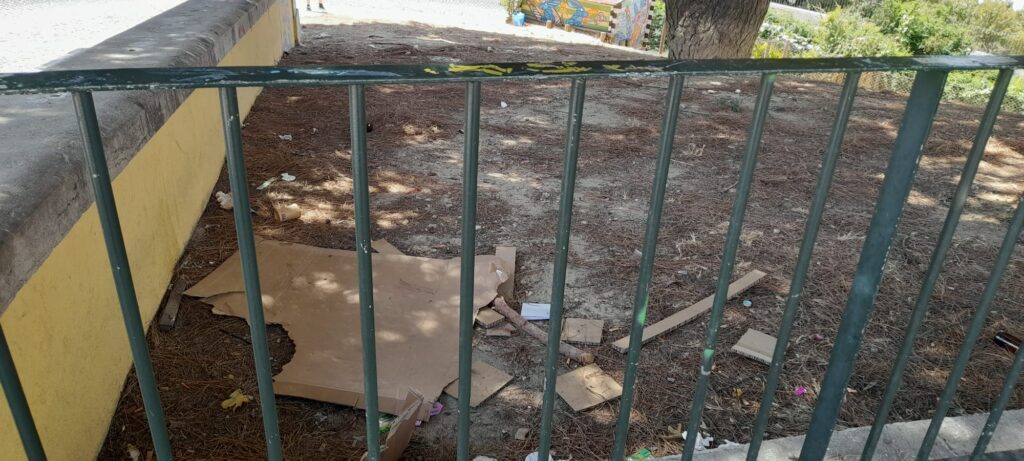 Na zona do parque infantil já não há tendas de sem-abrigo.No parque dos cães, permanecem cobertores e edredons, num abrigo improvisado que serve da “casa” a sem-abrigo que se instalaram naquele Jardim.No escorrega dos mais pequenos, encontrámos um pedaço de papel absorvente sujo, havendo sinais de que o pequeno abrigo de madeira é usado por adultos. Ao lado, um pedaço de cartão jazia no chão.