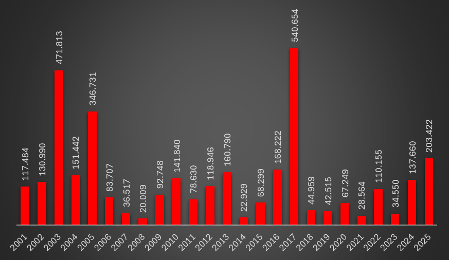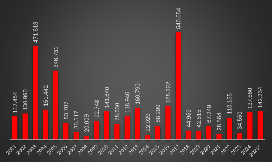 Em 2025, quando ainda se está em pleno mês de Agosto, a contabilidade dos incêndios já atingiu 172.065 hectares de área ardida, segundo dados do Instituto da Conservação da Natureza e das Florestas (ICNF), sendo o quarto pior do século, somente atrás de 2017, de 2003 (471.813 hectares) e de 2005 (346.731 hectares). Estes três anos vieram, aliás, colocar o patamar da destruição dos incêndios rurais num nível impensável no século XX, quando um “ano mau” significava valores ligeiramente acima de 100 mil hectares.