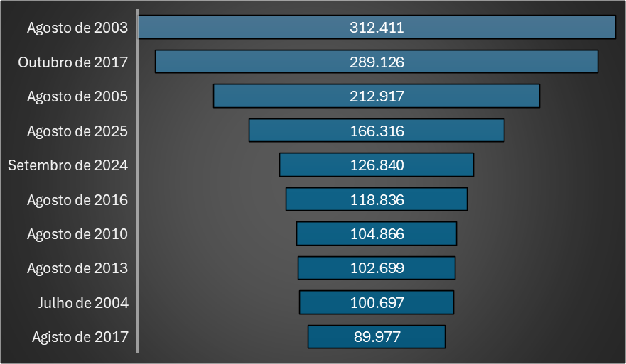 Se os números anuais já seriam suficientes para definir 2025 como ano negro, o retrato mensal não deixa espaço para dúvidas: este mês de Agosto, ainda por terminar, é já o quarto pior mês deste século, com 166.316 hectares consumidos em apenas 19 dias.