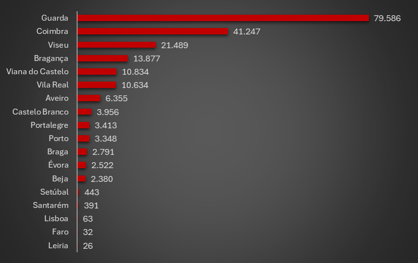 A fotografia estatística de 2025 tem um rosto particularmente sombrio: o distrito da Guarda. Com 79.586 hectares destruídos, este é já o pior registo distrital do século XXI, correspondendo a cerca de 15% do território total do distrito. Em termos relativos, é uma tragédia que não encontra paralelo recente, deixando claro que o Interior profundo, despovoado e envelhecido, continua a ser o palco principal da catástrofe florestal. A Guarda, sozinha, concentra quase 40% da área ardida de todo o país.