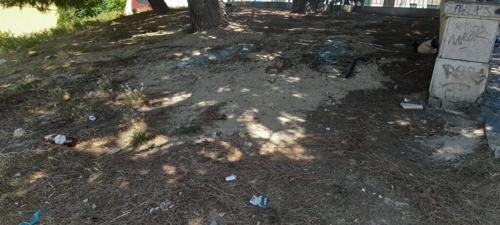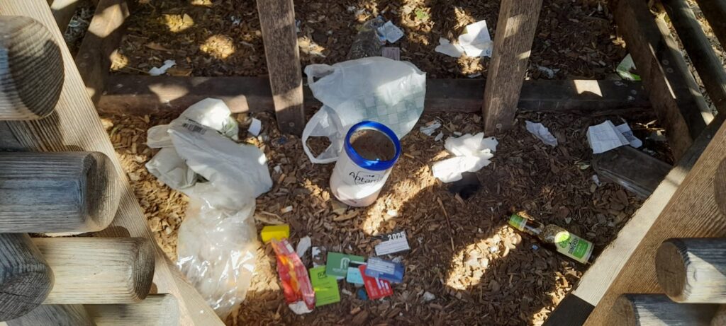 No parque infantil, o chão encontra-se repleto de dejectos de cães (ou pessoas), pontas de cigarros, lixo e isqueiros. Encontrei num dos escorregas uma pilha de lixo que inclui ‘restos’ de roubos: cartões bancários e de crédito, carteiras abertas. Seringas.