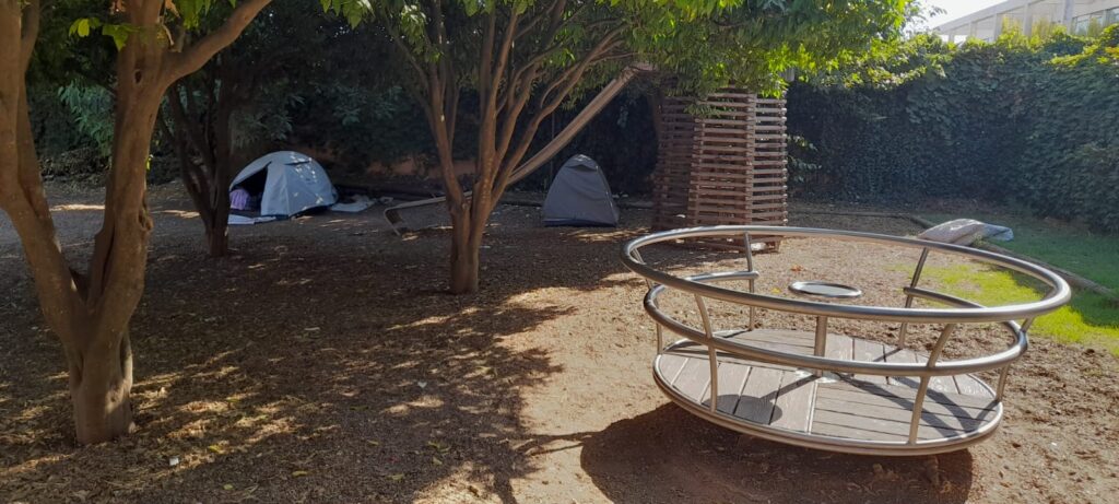 Ao lado do escorrega maior, três tendas ocupam o espaço destinado a correrias e brincadeiras de crianças. A mesa redonda existente no parque infantil, outrora usada para piqueniques e festas de aniversário infantis, estava ocupada por três jovens de aparência hippie e descontraída a fumarem drogas ‘leves’. O cheiro similar a ‘haxixe’ sente-se em várias zonas do parque infantil.