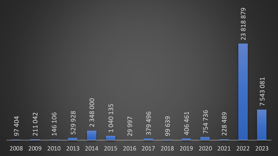 Evolução dos montantes anuais (em euros) de contratos públicos celebrados pela Motorola entre 2008 e 2023 (até 24 de Setembro). Fonte: Portal Base.