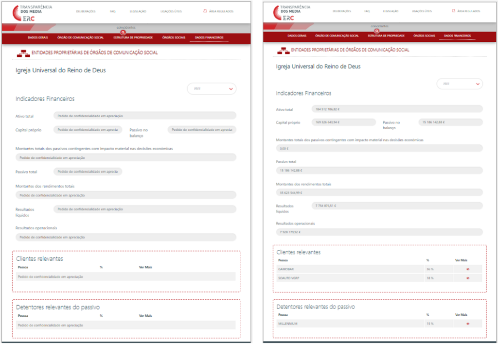 Na deliberação da ERC, aprovada em 30 de Agosto, não se faz qualquer referência aos elementos sobre os quais a IURD pediu escusa, mas esta entidade cristã evangélica e neopentecostal garantidamente terá solicitado a não divulgação dos indicadores financeiros, até porque o PÁGINA UM tem conhecimento do funcionamento do backoffice para submissão dos registos no Portal da Transparência e de como o regulador trata dos assuntos.