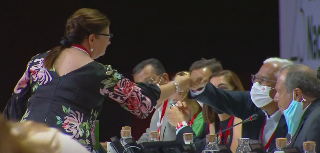 Um cumprimento sorridente entre Isilda Gomes e Giacomo Scalisi a selar um ajuste directo de 910 mil euros de dinheiros públicos inundados de irregularidades.