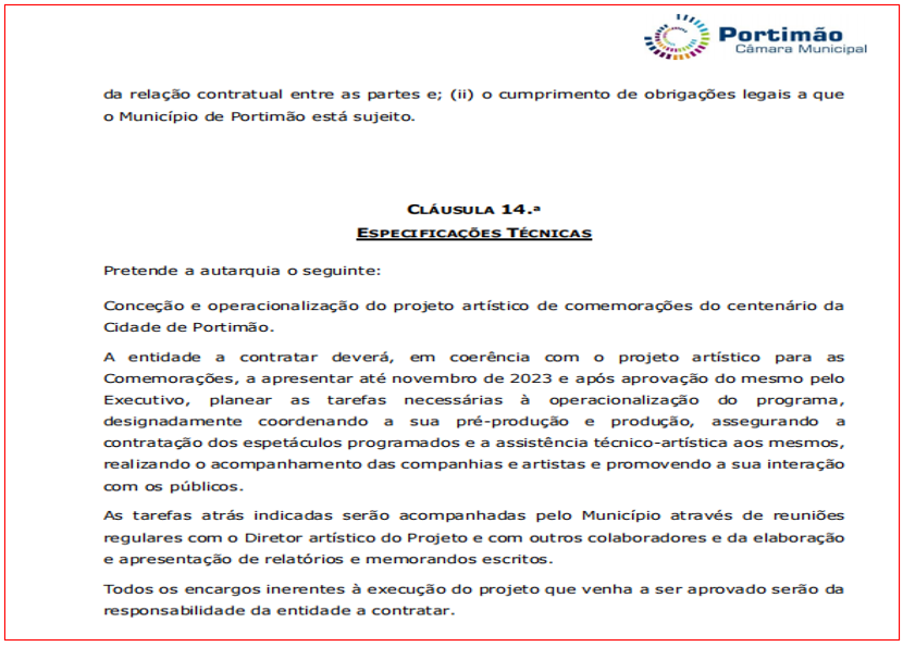 Porém, as singelas 14 linhas das especificações técnicas, que fazem parte da cláusula 14º do caderno de encargos com 14 páginas, diz apenas que a autarquia pretende a “concepção e operacionalização do projecto artístico de comemorações do centenário da Cidade de Portimão”, acrescentando que “a entidade a contratar [sabendo a autarquia que seria a Lavrar o Mar] deverá, em coerência com o projecto artístico para as Comemorações, a apresentar até Novembro de 2023 e após a aprovação do mesmo pelo Executivo, planear as tarefas necessárias à operacionalização do programa, designadamente coordenando a sua pré-produção e produção, assegurando a contratação dos espectáculos programados e a assistência técnico-artísticas aos mesmos, realizando o acompanhamento das companhias e artistas e promovendo a sua interação com os públicos”.