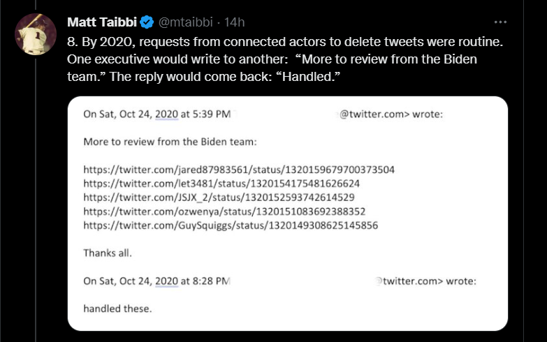 Em 2020, os pedidos de “atores” ligados [a responsáveis do Twitter] para apagar tweets eram rotineiros. Um executivo escreveria a outro: “Mais para rever da equipa Biden.” A resposta voltaria: “Tratado” [“handled”, em inglês].