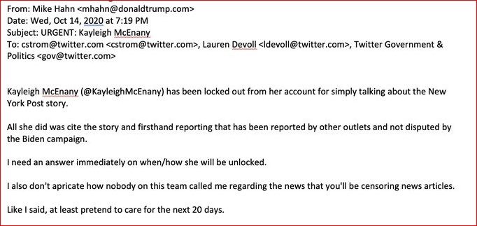 A [então] porta-voz da Casa Branca, Kaleigh McEnany, ficou sem poder entrar na sua conta por tweettar sobre a história, o que originou uma carta furiosa do funcionário da campanha de Trump, Mike Hahn, que dizia: “Pelo menos, finja que se importa com os próximos 20 dias”.