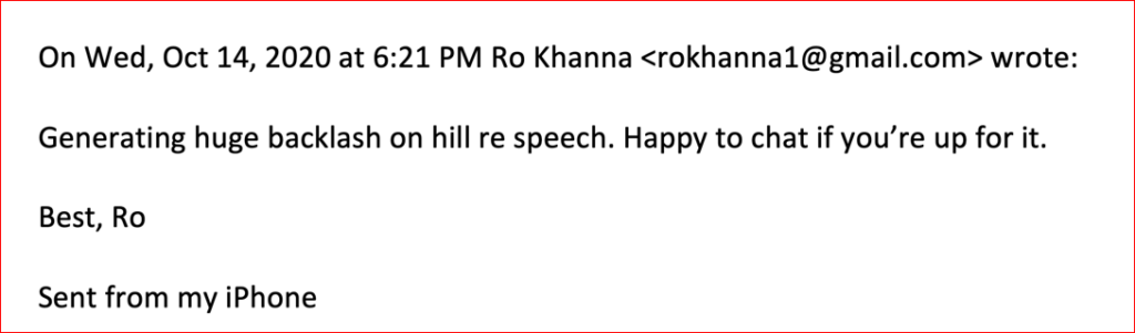 Numa troca humorística no dia 1, o congressista democrata Ro Khanna contacta Gadde para sugerir gentilmente que falem ao telefone. Khanna foi o único [congressista] democrata que encontrei nos ficheiros que expressava preocupação.