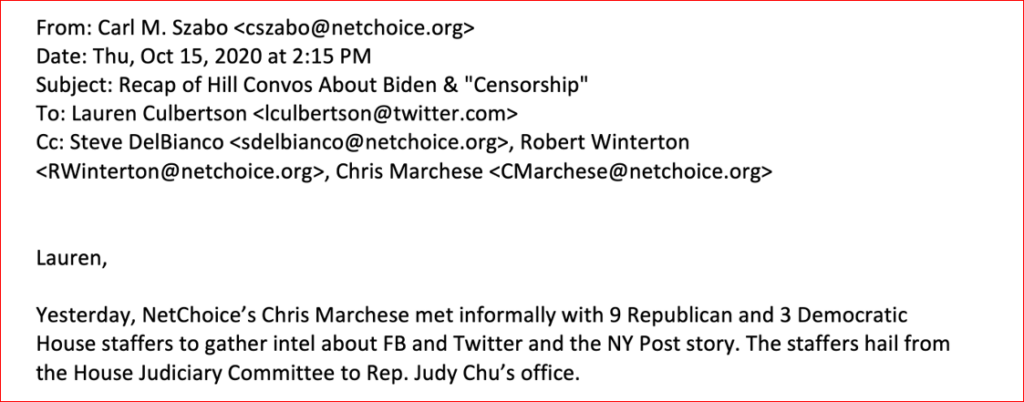 No espaço de um dia, a responsável pela Política Pública, Lauren Culbertson, recebe uma carta/relatório medonho de Carl Szabo da empresa de investigação NetChoice, que já tinha inquirido 12 membros do Congresso – 9 Republicanos e 3 Democratas, desde “a Comissão Judiciária da Câmara ao Gabinete da Rep. [Representante] Judy Chu”.